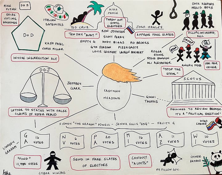 As a special token of appreciation for my founding Wine & Fries members who have gone above and beyond in their support, I would like to send you a custom tote bag with two Asha Rangappa original drawings: The Trump coup chart and a Venn diagram of the categories of evidence found at Mar-a-Lago. (I’m told the latter is technically a Euler diagram but it’s a Venn diagram AFAIC.)