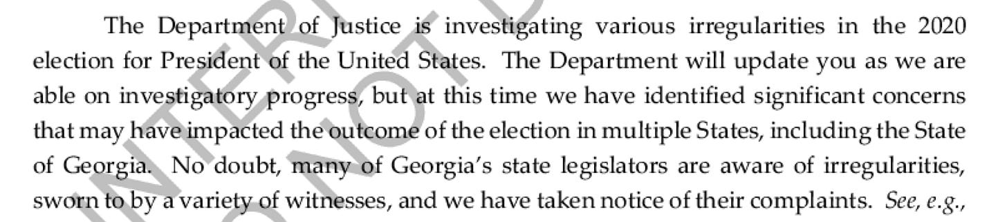 The letter was intended to be sent against the backdrop of Trump’s lawyers (including Giuilani, again) presenting false evidence of voter fraud to Georgia legislators in an attempt to get them to change their slate of electors. As with the Zelensky phone call, a letter from the Justice Department would have served as legitimizing propaganda for Giuliani’s (and Trump’s) claims. It also would have provided legitimacy for Georgia to convene a special session of the General Assembly and call its slate of electors into question. (Clark never sent the letter because it was rejected by his boss, acting Attorney General Jeffrey Rosen; Trump’s attempt to oust Rosen and install Clark failed when several senior Justice Department officials threatened to resign en masse if he tried to do so.)