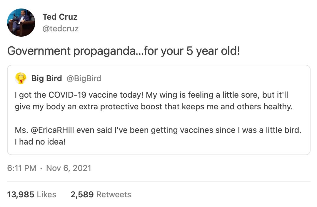 Still, it feels weird classifying Reagan’s speech as propaganda. After all, he wasn’t lying, nor was he being deceptive — he wasn’t obscuring, for instance, that he was speaking on behalf of the United States, as its leader. Many people think of “propaganda” in the pejorative sense, as speech that involves lies, manipulation, and distortion. In fact, it’s often leveled as an accusation to discredit messages from messengers with influence, like this attack by Ted Cruz on…Big Bird.