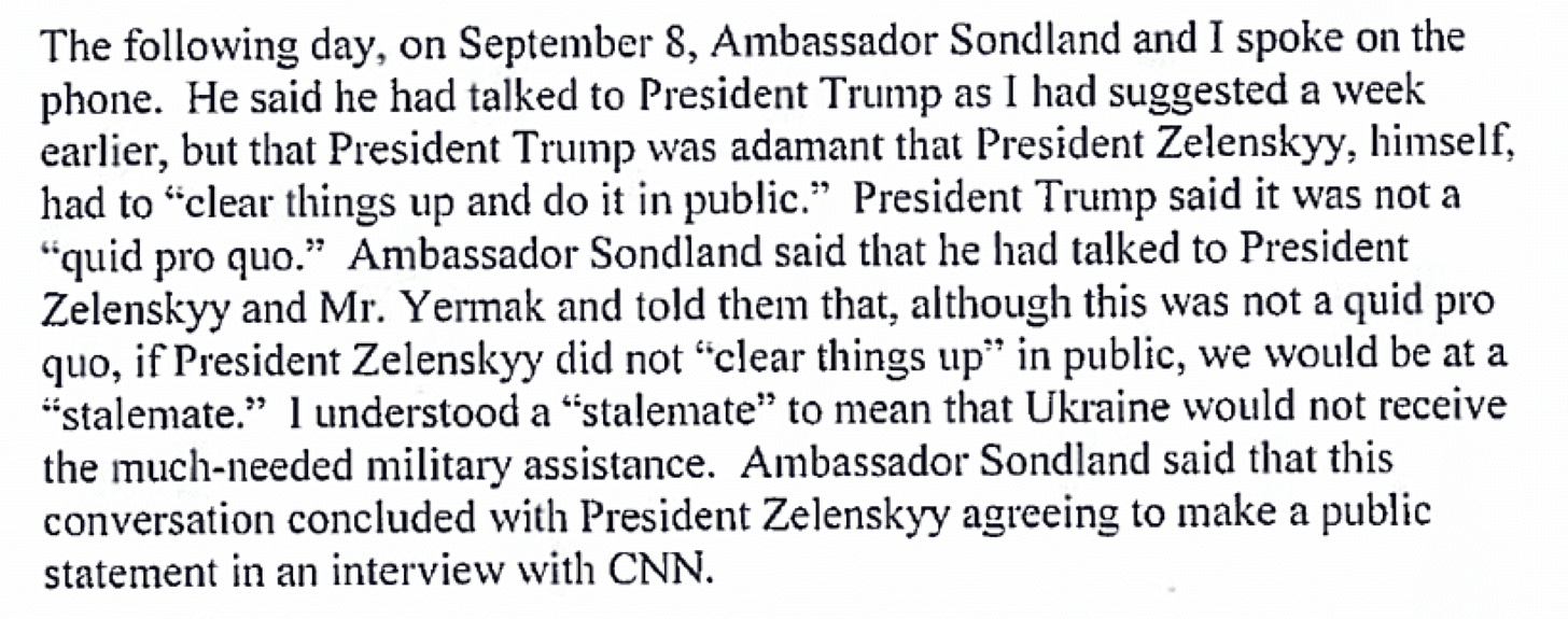 Based on Giuilani’s feedback, Volker and Sondland craft the following statement for Zelensky to make in a public setting, like a press conference (Andrey Yermak was Zelensky’s aide).