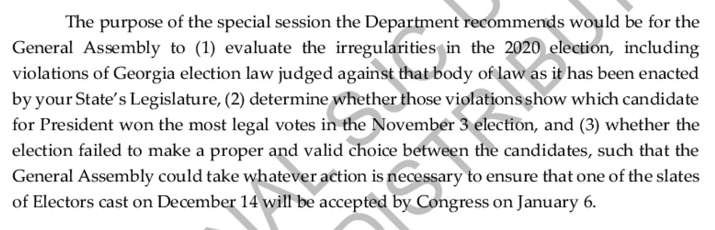 The letter goes further, advising Georgia legislators that they should convene a special session of the General Assembly to investigate these “irregularities” and “take whatever action necessary” to ensure a proper slate of electors on January 6.