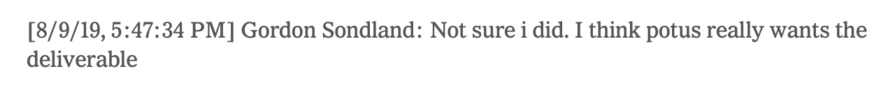 Text messages between Giuilani, Special Envoy to Ukraine Kurt Volker, and EU Ambassador Gordon Sondland, however, reveal that the goal was not so much an actual investigation, but the announcement of one. Volker and Sondland discuss that although Zelensky promised to look into the matter on the phone, Trump wasn’t going to be satisfied until he got the “deliverable” — for Zelensky to say so publicly.