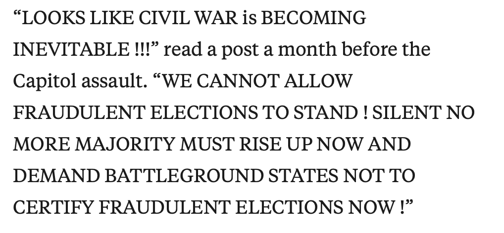 It’s tempting to look at January 6 as an effort that Trump got rolling in the months leading up to the 2020 election. Indeed, the final report of January 6 Committee details how Trump began making claims of voter fraud and delegitimizing the election going back as far as April 2020. ProPublica has also detailed how calls for “civil war” became intensified in the nine weeks between Election Day and January 6, with posts like the following: