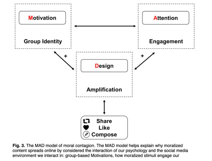 Let me introduce you to the work of my Yale colleague, psychologist Molly Crocket, and her two coauthors, William Brady and Jay VanBavel, who came up with something called the M.A.D. Model of Moral Contagion. The model explains how group identity, user behavior, and the design of social media platforms interact in synergistic ways to spread mostly highly emotionally-reactive content. You can read the whole piece (and I recommend it), but their simple diagram is really all you need to follow along as I pull out the main points: