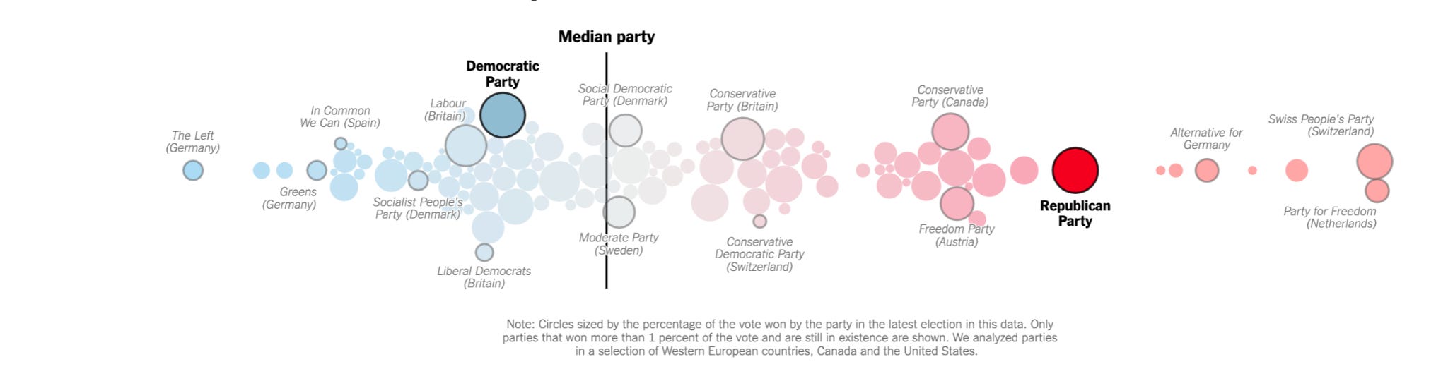 We had a great discussion about political polarization and its manifestation in the dysfunction over choosing a House Speaker. One thing that often gets overlooked/underdiscussed is that the polarization in the U.S. is asymmetrical — as illustrated by the following diagram from this interesting New York Times opinion piece from 2019 (I suspect that the Republican Party would be plotted farther to the right today.)