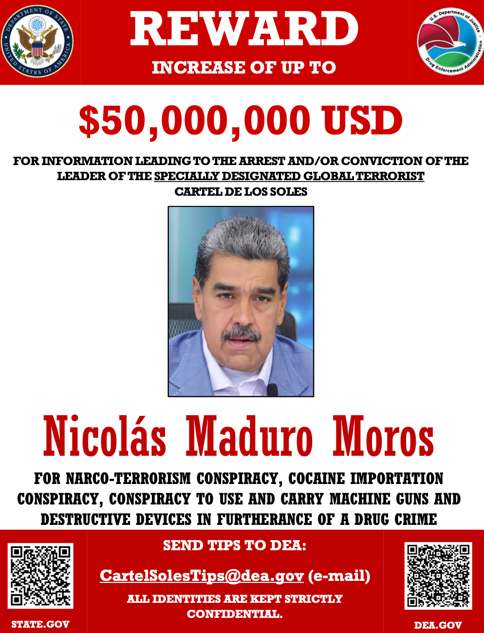 In March 2020, Maduro was indicted in the Southern District of New York with narco-terrorism, conspiracy to import cocaine, possession of machine guns and destructive devices, and conspiracy to possess machine guns and destructive devices. Today, Attorney General Pam Bondi stated that Maduro will stand trial on these charges.