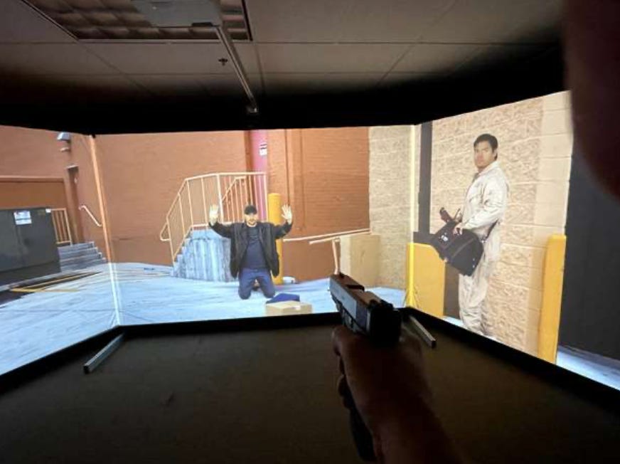 FATS is a life-size video screen connected to a laser pointer firearm where you, the agent traineee (holding said firearm), are part of a two-person team going to do some kind of investigative activity. Maybe you’re looking for a suspect, maybe you’re serving a subpoena, maybe you’re going to effect an arrest. And then, something goes wrong. The suspect runs. Your partner is attacked. A kid comes around the corner during the interview holding a gun. (Seriously, that was one of the scenarios and it still gives me terrible flashbacks.) At that moment, you have to decide what to do. In a matter of seconds, you have to assess the situation, yell commands if feasible, and decide: Shoot or don’t shoot. You know if you made the wrong choice if the entire screen goes red.