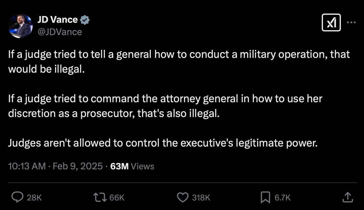That is definitely the subtext, but it’s even worse. Vance’s tweet is very carefully worded. If you read closely, he says that judges can’t control an executive’s legitimate power. I mean, duh. And he uses as examples two scenarios that involve exclusive and core executive branch functions: the Commander in Chief and Take Care authorities under Article II of the Constitution. Again, duh.
