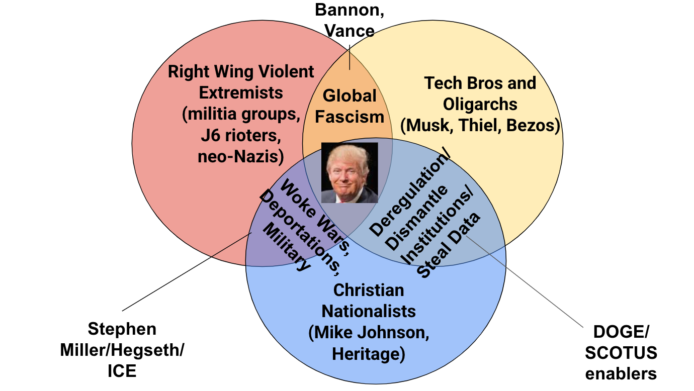 I’ve put Trump in the middle of this diagram because I don’t think he has any particular preference among these three bubbles: Since he is antidemocratic, racist, and intellectually lazy himself, any of these will suit him just fine (especially if they help him get revenge on enemies and profit off the presidency).