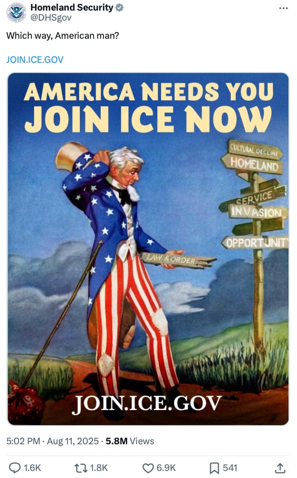 This, of course, then makes it easier to attract them with certain propaganda campaigns. You remember The Turner Diaries, above? Well, the below is a DHS recruiting post on X, for ICE. The post asks, “Which way, American man?” which appears to be a reference to a novel by William Hayley Simpson, Which Way, Western Man?, which was also a foundational text for the white power movement and published by a press founded by the author of The Turner Diaries. Though perhaps it’s all a coincidence.